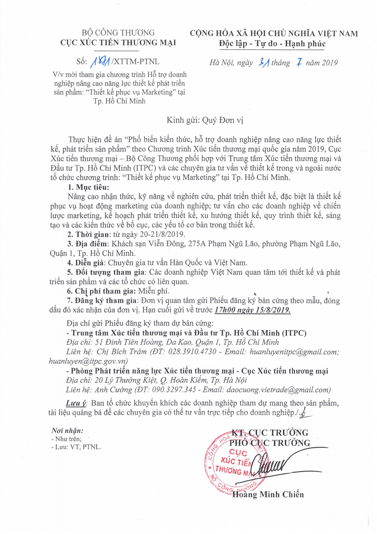 Đăng ký tham gia: Gửi phiếu đăng ký bản cứng theo mẫu, đóng dấu đỏ xác nhận của đơn vị. Hạn cuối gửi về trước 17h00 ngày 15/8/2019.